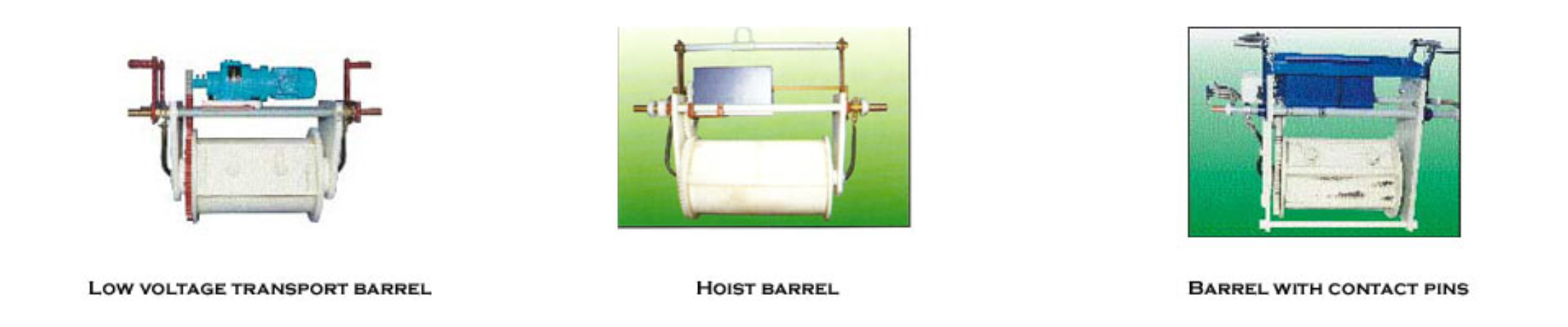 Special Barrelling Units are made to meet production requirement. The 2 units on left side is for a hoist lifting mechanism having plating & rinsing tank attachments, while the 2 units on right is two Barrels plating set up with fittings for doubling output. Any type of tailor made Barrel can be designed and fabricated. from 5 kg to 80 kg capacity.