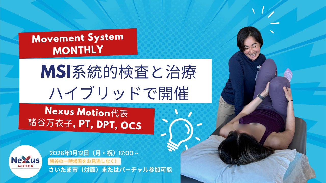 運動病理学的モデルをベースとして、筋骨格系疼痛に悩んでいる患者さんをどのように評価し分類し治療するのか?MSI の創始者サーマン先生から絶大な信頼を受けている諸谷万衣子先生は、英語圏 MSI 講習会の企画者でもあり、Nexus Motion 代表の理学療法士でもあります。諸谷先生が東京に一時帰国している間に対面およびバーチャルで評価と治療の流れを勉強しませんか?対面参加される方に被験者となってもらいます。